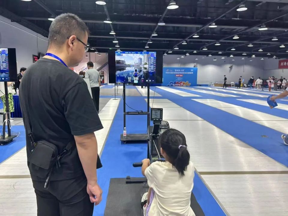 本次职业体验特别设置了“亲子活动区”,设有合力建塔、拓印等项目。父母们弯腰俯身,与孩子共同挥拍,协作配合。家长们化身“临时教练”和“最佳队友”,在欢声笑语中引导孩子提升手眼协调力与专注力。活动现场的划船机体验区,则让孩子们通过增强现实(AR)技术,体验了未来科技与体育竞技结合的新形态。一位10岁的小朋友在体验后说,划船机体验给他留下了深刻印象,这个项目科技感十足,看着前面的屏幕,仿佛在苏州河上划船一样,还能“途经”乍浦路桥等虹口地标性建筑,可以边欣赏美景,边运动。